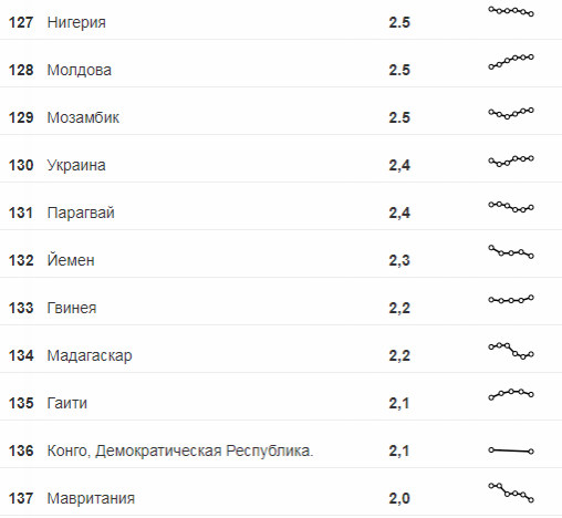 Далее следуют Демократическая Республика Конго и Гаити, набравшие по 2,1 баллу из 7 возможных. Мадагаскар и Гвинея заняли четвертое и пятое место. Эти страны получили по 2,2 балла. Далее следуют Йемен (2,3 балла), Парагвай (2,4 балла), Украина (2,4 балла), Мозамбик (2,5 балла) и Молдавия (2,5 балла). Россия в рейтинге занимает 114 место.