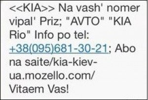 «Автоцентр на Борщаговке» не имеет никакого отношения к SMS-сообщениям с информацией о выигрыше автомобиля. Со всеми деталями розыгрышей и акций, проводимых в рамках «Автоцентр на Борщаговке» можно ознакомиться на сайте kia-motors.net в разделах «Новости». Все официально проводимые акции от «Автоцентра на Борщаговке» имеют широкую поддержу в украинских средствах массовой информации. Просим всех наших клиентов внимательно относится к сомнительным сообщениям, которые призывают к переводу личных средств с целью получения выигрыша.