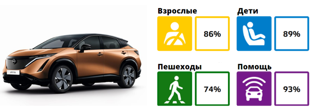 «Безопасность пешеходов» оценили в 74%. Лучший результат в категории – 93%. Кажется, что показатель «Арии» не так хорош, но он выше, чем у большинства электрокаров.