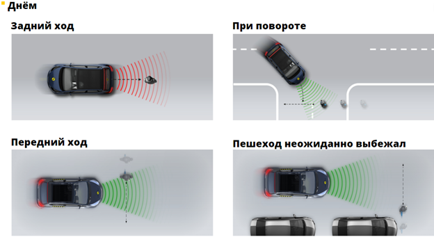 • В светлое время суток: задний и передний ход; при повороте; когда пешеход неожиданно выбежал на дорогу.