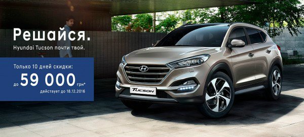 Праздники еще не наступили, но мы готовы радовать Вас уже сейчас! Только десять дней у нас действует скидка до 59 000 грн. на различные комплектации и модификации нового Hyundai Tucson!.