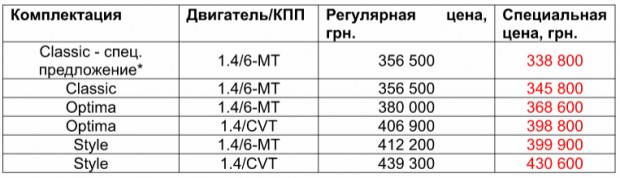 Вариант Classic предусматривает наличие такого оборудования: две подушки безопасности, ABS+ESP, кондиционер с фильтром салона, передние электростеклоподъемники, центральный замок и иммобилайзер, электрорегулировка и обогрев зеркал заднего вида, запасное колесо, обогрев заднего стекла, розетка 12В и другие, не менее полезные опции.