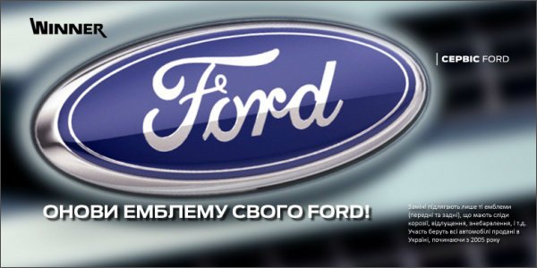 Компания «НИКО Форвард Мегаполис» приглашает владельцев Ford, автомобили которых достигли 4-летнего возраста в 2015 году и были куплены в Украине с 2005 года в официальной дилерской сети Ford, посетить дилерский центр и бесплатно заменить старую эмблему Ford на новую. Кроме обновления эмблемы, автовладельцы также получают бесплатную консультацию от специалистов сервиса относительно технического состояния своего автомобиля, а также информацию о всех возможностях обслуживания на станции.