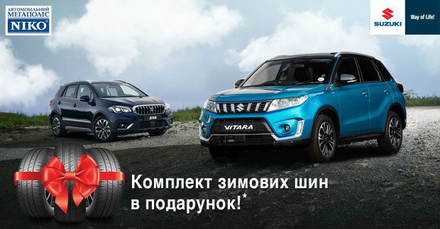 *Акція діє з 21.10.2019р. по 31.12.2019р. в дилерському центрі «НІКО Істлайн Мегаполіс». Під подарунком мається на увазі можливість придбання зимового комплекту коліс марки Tigar за 1.20 грн з НДС. Умови акції не розповсюджуються на модель Suzuki Jimny. Акція не сумується з іншими спеціальними пропозиціями і діє при підписанні договору купівлі-продажу з 21.10.2019р. по 31.12.2019р..