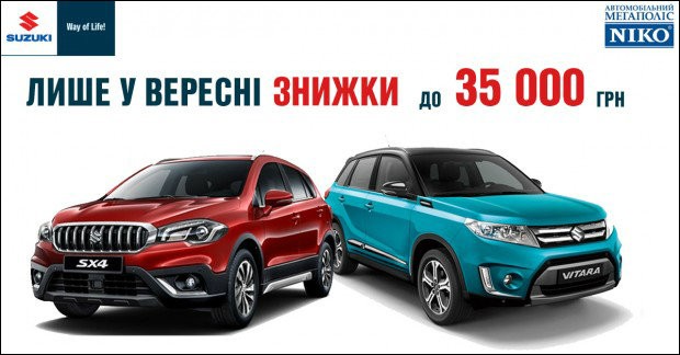 «НИКО Истлайн Мегаполис», официальный дилер Suzuki в Киеве и Киевской области, предлагает 35 000 грн. скидки в сентябре на кроссоверы Suzuki - Suzuki SX4, Vitara і Grand Vitara.