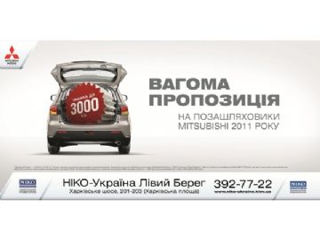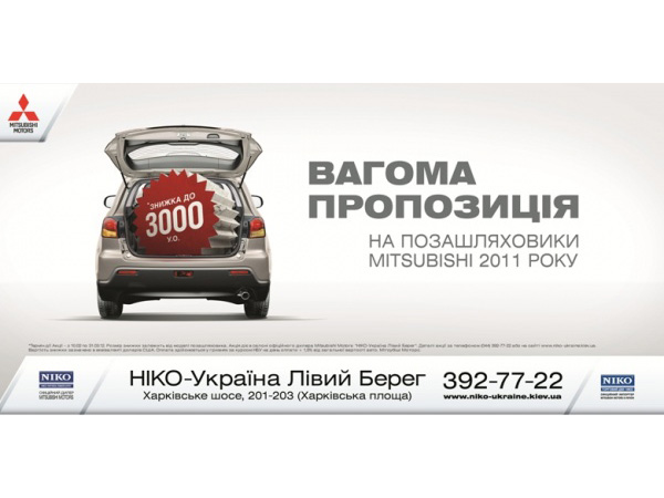 Чтобы поддержать весеннее радостное настроение и сделать настоящий подарок поклонникам легендарной японской марки, «НИКО-Украина Левый Берег» до 31 марта предлагает приобрести автомобили Mitsubishi 2011 года выпуска с грандиозными скидками* – до 3 000 у.е.