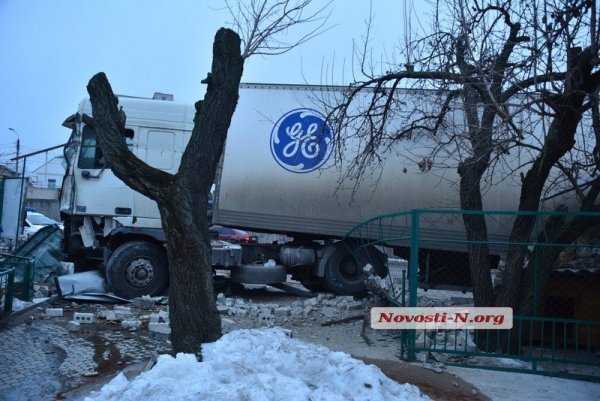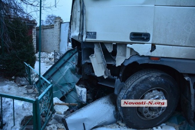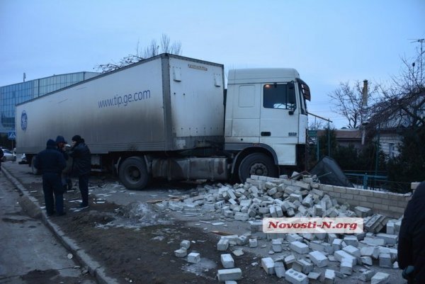 Вечером, 14 февраля, в Николаеве грузовик DAF с полуприцепом снес кирпичный забор и въехал во двор жилого дома.