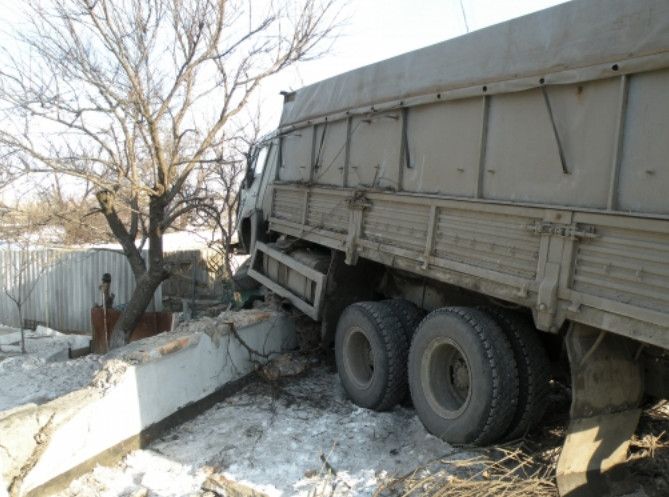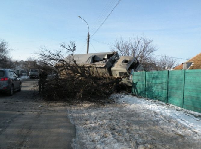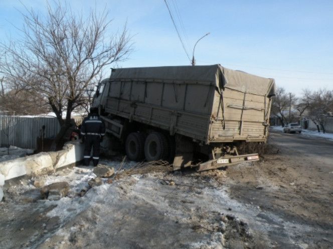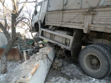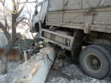 Около 8 утра 20 февраля движущийся по ул.Кирова КАМАЗ с прицепом вдруг резко вильнул влево, вылетел на тротуар и врезался в каменный забор дома № 19. По пути автомобиль еще и начисто снес старое абрикосовое дерево. , сообщает .