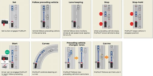 ProPILOT автоматически контролирует дистанцию до впередиидущего транспортного средства с учетом диапазона скоростей движения, заданного водителем и работает в пределах от 30 до 100 км/ч. Система также автоматически может задействовать тормозную систему даже если водитель не нажимает на педаль тормоза. Как только появляется возможность возобновить движение, система ProPILOT снова может быть активирована водителем с помощью переключателя или педали акселератора.
