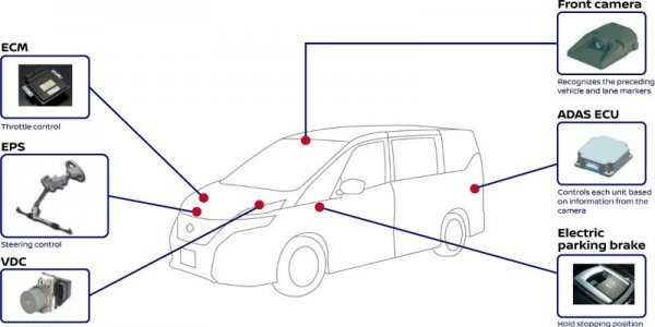 Акселератор, тормозная система и рулевое управление контролируются на основе информации, получаемой камерой системы ProPILOT. Устройство оснащено специальным программным обеспечением для обработки изображений и способна быстро определять как положение транспортного средства, находящегося впереди, так и линии дорожной разметки.