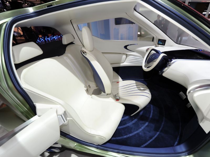 Прототип получил интересную "диагональную" компоновку интерьера: водитель сидит почти в центре, тогда как кресла задних пассажиров смещены к борту салона, что обеспечивает им улучшенную обзорность. Пассажирские кресла можно снять, получив плоский пол, под которым спрятаны комплект электродвигателей и водородные топливные элементы.