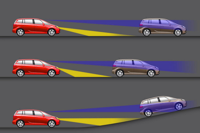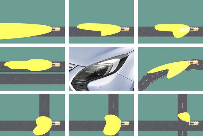 Благодаря слаженной работе камеры, фар и бортового компьютера, автомобиль "сам" вовремя и должным образом освещает для своего водителя практически любое изменение дорожной ситуации.