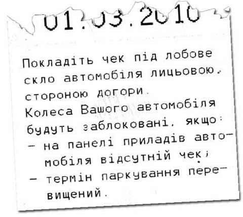 Остальным придется раскошелиться - можно оплатить стоянку с помощью мобильного телефона (услуга работает давно) либо купив талон: заранее (в киосках «Союзпечати») или в паркомате. В последнем случае на чеке выбивается дата и время. Простоять дольше купленного времени нельзя - натянут растяжку, а чтобы ее снять, потребуют 170 гривен. Платить можно на месте и через банк - парковщики выдают квитанцию, указывая расчетный счет.