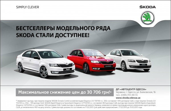 SKODA заботится о своих клиентах, поэтому в период с 17 февраля по 31 марта 2015 года в Автоцентре SKODA на Балковской,16, бестселлеры модельного ряда SKODA стали доступнее! Не упустите возможность приобрести новую SKODA по специальной цене! Количество автомобилей ограничено!.
