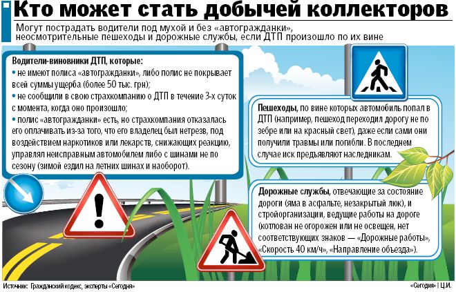 Сбивать долги с дорожных служб коллекторы берутся неохотно, только если вина дорожных служб явная (открытый люк, не обозначенные дорожные работы, а не просто яма в асфальте). По словам исполнительного директора Ассоциации участников коллекторского бизнеса Артема Кучина, юридически все законно, ибо речь идет не о покупке долгов, а о поручении их взыскать в пользу кредитора за вознаграждение, что предусмотрено Гражданским кодексом. «Небольшие суммы, до 10 тыс. грн, обычно удается взыскать до суда, а вот если ущерб намного больше — только через госисполнителей, — говорит Кучин. — Мы также соглашаемся на постепенную выплату долга, поэтому многие должники идут на мировую».