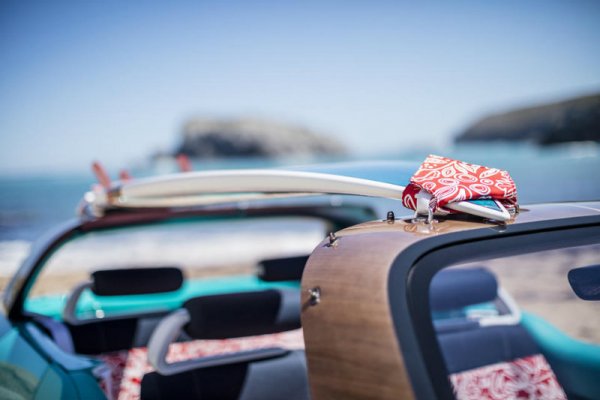Дизайн салона напоминает корпус судна. Материалы обивки и покрытие приборной панели разрабатывались в стиле комбинезонов для серфинга. Неопреновая ткань позволяет повысить герметичность сидений и ускорить их высыхание. В передних дверях размещены вместительны ниши, закрытые сеткой, к багажнику есть наружный доступ, а благодаря специальной системе креплений на крыше можно зафиксировать две доски для серфинга. При помощи ручки, расположенной на приборной панели справа от руля, водитель может выбрать один из четырех режимов вождения: стандартный режим, бездорожье, снег или песок.