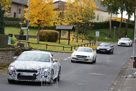 Издание AutoWeek опубликовало шпионские фотографии тестового прототипа купе Audi TT следующего поколения. Автомобиль был заснят во время заводских ходовых испытаний и сравнений с потенциальными конкурентами в лице Mercedes-Benz SLK, BMW Z4 и Peugeot RCZ.