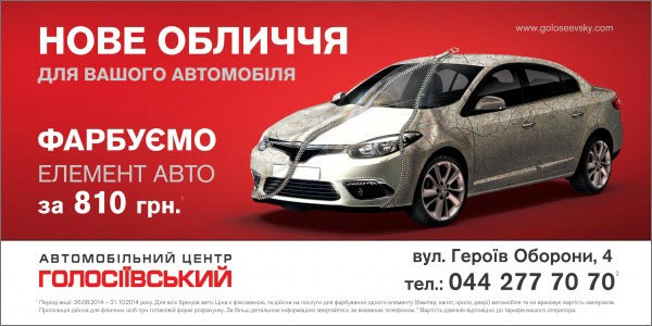 с 26.08.2014 по 31.10.2014 в Автомобильном центре Голосеевский проводится акция, в рамках которой наши клиенты смогут покрасить один элемент кузова всего за 810 грн., при этом, получить дополнительно 20% скидки на материалы.