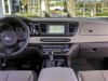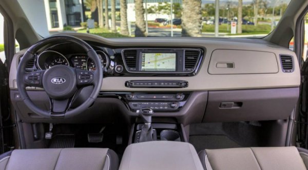 Интерьер Kia Carnival смотрится стильно и современно: щиток приборов с двумя крупными "колодцами" и цветным экраном, мультифункциональный трехспицевый руль и широкая центральная консоль, которую венчает расположенный между воздуховодами печки сенсорный экран.