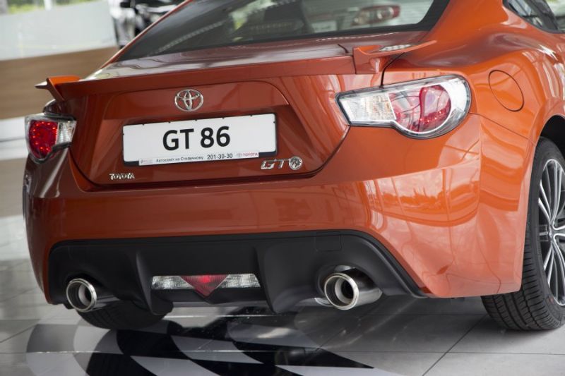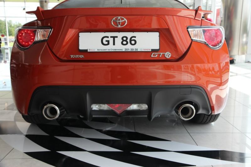 Внешне Toyota GT86 выглядит довольно грозно благодаря агрессивному разрезу фар и большому воздухозаборнику по центру. На автомобиль установлена резина 17-го размера, но рельефные крылья намекают, что сюда подойдут и бОльшие колеса. Сзадли спорткупе выглядит оригинально и самобытно благодаря фарам и внушительному диффузору с двумя выхлопными патрубками. В завимости от комплектации на крышке багажника будет низкий или высокий спойлер.