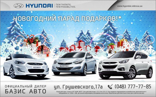 Теперь вы можете получить от зимы максимум плюсов! Чтобы настроение было праздничным, а эмоции — позитивными, АВТОЦЕНТР HYUNDAI БАЗИС АВТО дарит своим клиентам специальные условия приобретения автомобилей Hyundai !.