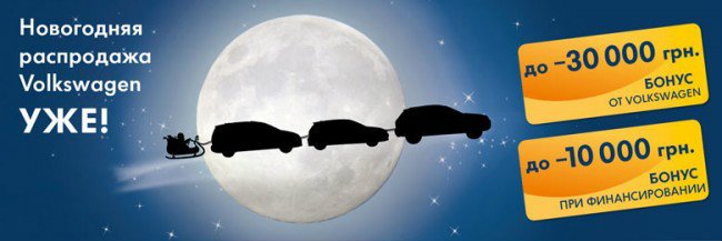 Начиная с 18 октября и до 31 декабря 2013 Вы имеете прекрасную возможность приобрести свой Volkswagen по выгодной цене! Новогодние скидки до 30 000 грн действуют практически на весь модельный ряд автомобилей Volkswagen, а в условиях финансирования от финансовой Группы Порше скидка дополнительно возрастает.