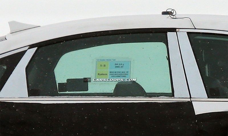 Судя по надписи, тестируемый прототип обладает 3,8-литровым двигателем V6, автоматической коробкой передач и системой полного привода.