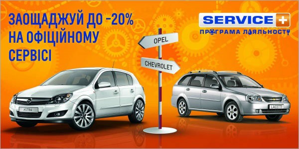 В дилерской сети официального дистрибьютора Opel и Chevrolet – компании «Дженерал Авто Груп», действует система лояльности SERVICE+, которая позволяет получить до 20% скидки на оригинальные запасные части и до 15% на сервисные услуги! Скидки по программе SERVICE+ применяются как отдельно от программы лояльности CarMAN@CarWOMAN, и в таком случае составляют 13% на запасные части и 8% на сервисные услуги, так и суммируются со скидками согласно номиналу дисконтной карточки 3%, 5% или 7% по программе лояльности CarMAN@CarWOMAN. Получить дисконтную карточку и стать участником программы лояльности CarMAN@CarWOMAN в случае ее отсутствия возможно при обслуживании автомобиля в дилерской сети УкрАВТО на сумму свыше 500 грн.