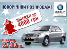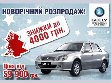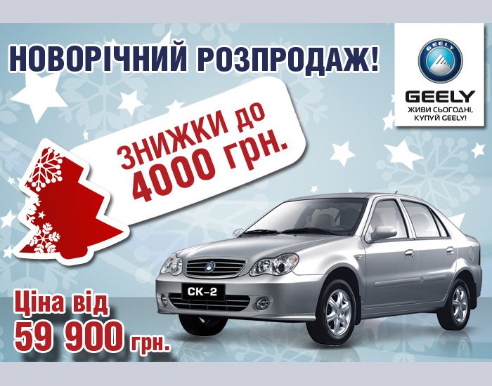 В Новый Год – на новом автомобиле! С таким громким кличем стартовала праздничная акция на автомобили Geely, а именно на наиболее востребованные модели СК-2, МК или МК-2. Включительно до конца января 2012 года, каждый желающий может приобрести всеми полюбившиеся автомобили по невероятно низким ценам – от 59900 грн. За эту относительно скромную сумму покупатель получал качество и отменно укомплектованный автомобиль, готовый к любым испытаниям на отечественных дорогах!