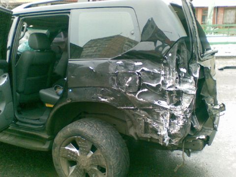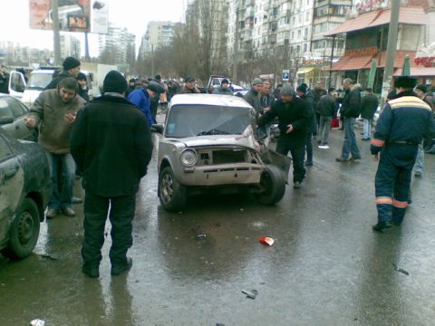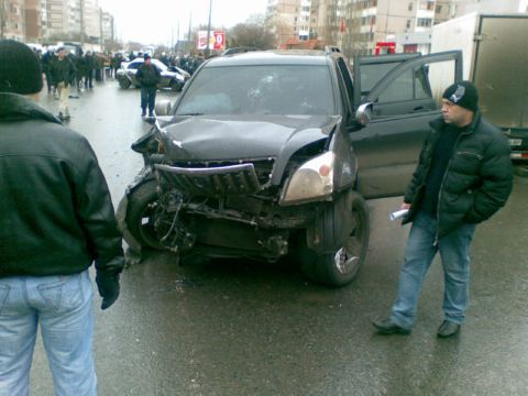 После удара «Ланос» отнесло в сторону, где он столкнулся с Мицубиши, которая в свою очередь задела две стоящих рядом «Тойоты». От удара у джипа перекосило колесо, и автомобиль вынесло на встречную полосу, где он совершил столкновение еще с шестью машинами, припаркованными на стоянке. В конечном итоге повреждения получили 11 автомобилей, 5 из них -не подлежат восстановлению.