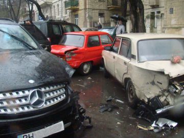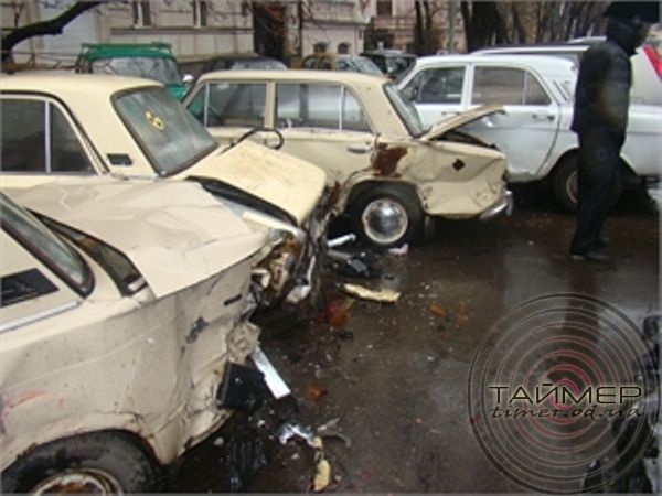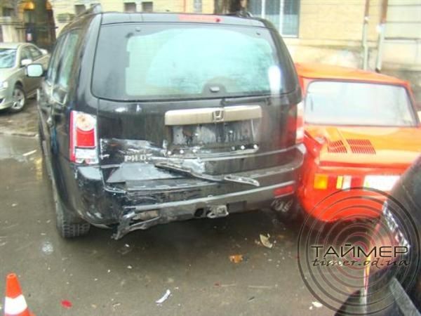В результате его «маневра» пострадали три автомобиля марки ВАЗ, один автомобиль ЗАЗ, один ГАЗ 24, Honda Pilot и Nissan X-Trail. Стоящим в ряд трем «жигулям» не повезло больше всего, не укрылся от внезапной беды и малогабаритный «запорожец».