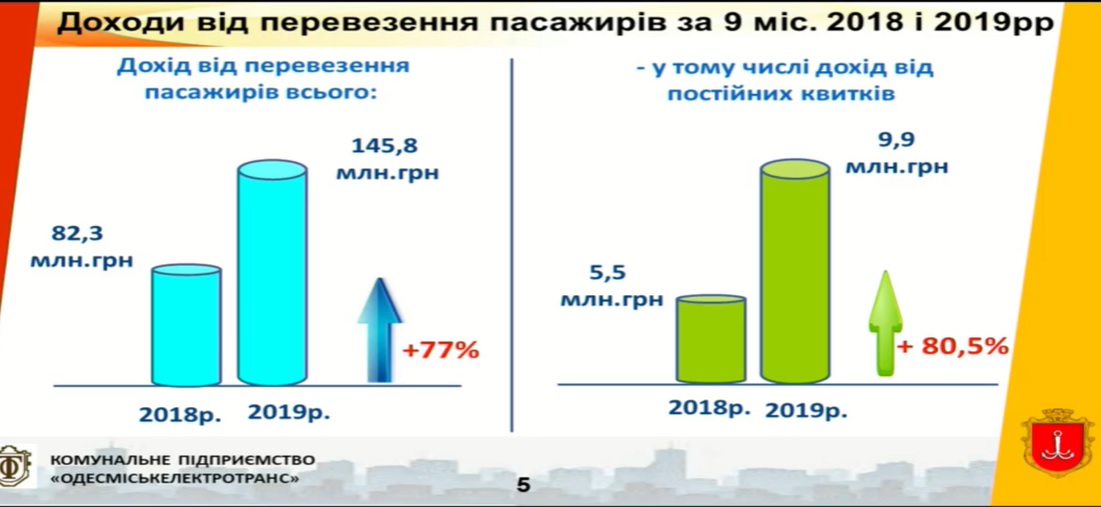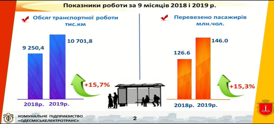 На проходившем 21 октября в одесской мэрии аппаратном совещании заместитель директора КП "Одесгорэлектротранс" Наталья Колесниченко рассказала, что за девять месяцев 2019 года, с января по сентябрь, электротранспорт Одессы перевез 146 миллионов пассажиров. Для сравнения - за те же девять месяцев 2018 года этот показатель составил 126,6 миллионов пассажиров. Также, по словам Колесниченко, вырос объем транспортной работы, выраженный в общем пробеге трамваев и троллейбусов: 10 миллионов 702 тысячи километров за 9 месяцев 2019 года против 9,25 миллиона километров за 9 месяцев 2018 года.