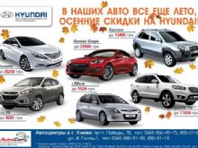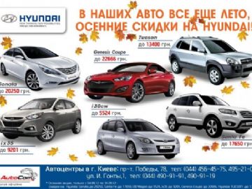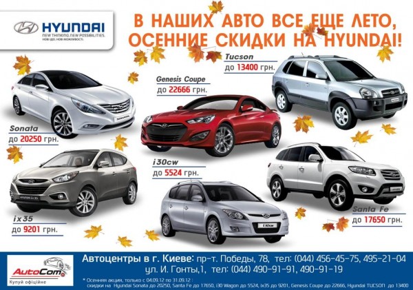 Акция от компании ООО «АВТОКОМ.» - официального дилера Hyundai в Украине. Осенние скидки на Hyundai Sonata до 20250 грн, Santa Fe до 17650 грн, i30 CW до 5524 грн, ix35 до 9201 грн, Genesis Coupe до 22666 грн, Hyundai TUCSON до 13400 грн. Акционное предложение действует до 30-го сентября.