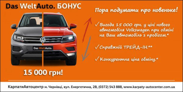 * Спеціальна пропозиція діє з 21 лютого до 21 квітня 2017 року для нових автомобілів марки Volkswagen. Акційна знижка включається у ціну реалізації автомобіля згідно договору купівлі-продажу. Деталі щодо автомобілів, залучених до акції, їх моделі, комплектації тощо уточнюйте, будь ласка, у дилера Das WeltAuto Чернівці. Кількість нових автомобілів обмежена.