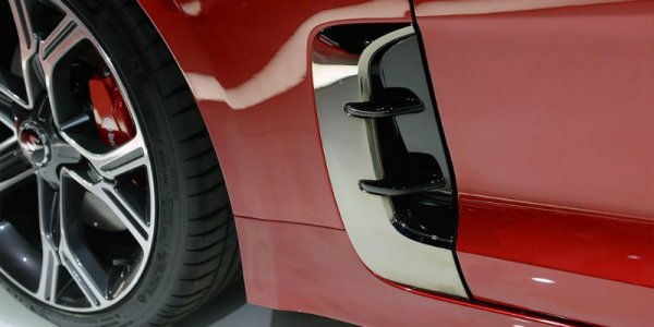 Автомобиль получил светодиодную оптику, большие колесные диски, двойные воздухозаборники и спойлер. Длина автомобиля составляет 4,8 м, а ширина - 1,87 метра. Колесная база машины равна 2,9 метрам. Таким образом, Stinger GT стал одним из самых больших автомобилей в своем сегменте.