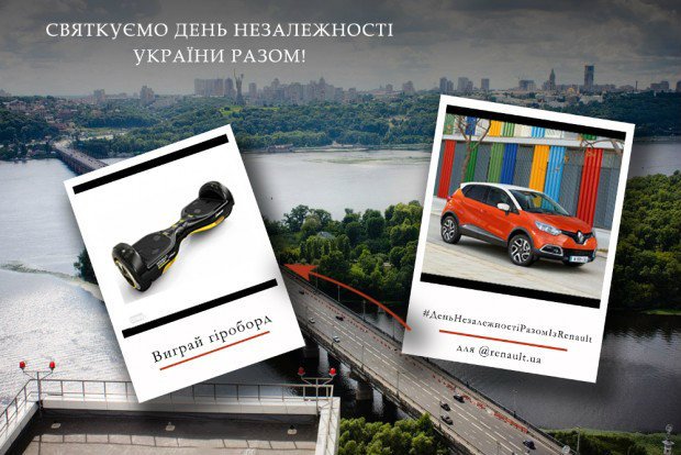 Компанія Renault в Україні підготувала до Дня Незалежності України цікавий розіграш фірмового гіроборда з Renault Boutique в соціальній мережі Facebook.