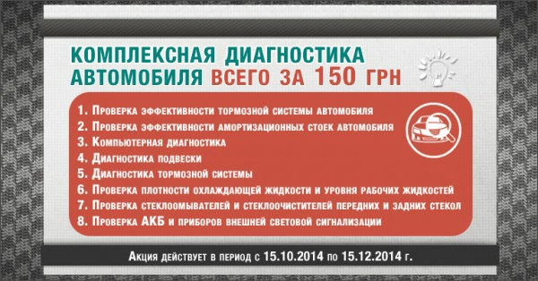 Только с 15.10 по 15.12. 2014 года Вы сможете пройти полную комплексную диагностику своего авто всего за 150грн.