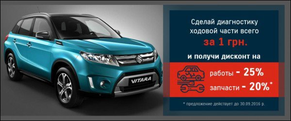 Жаркое лето почти заканчивается! Долгожданные отпуска, путешествия, дальние поездки по раскаленным дорогах и внедорожным трассам уже позади. Именно поэтому станция технического обслуживания дилерского центра «ВиДи Гранд» рекомендует уже сейчас начать сезон выгодного сервиса, в рамках которого провести диагностику ходовой части вашего Suzuki всего за 1 грн, и при этом получить дисконт на сервисные работы в размере до 25% и на запчасти до 20%*.