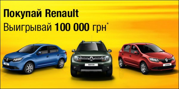 Только с 21 марта по 17 апреля 2015 году каждый, кто приобретет любую модель Renault в официальной дилерской сети, сможет выиграть 100 000 грн.
