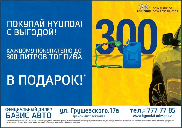 300 литров топлива в ПОДАРОК КАЖДОМУ* покупателю автомобиля Hyundai только в нашем Автоцентре.
