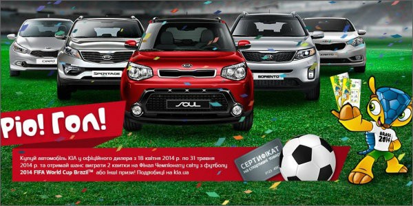 Только до 31 мая 2014 года, купив автомобиль КІА, Вы имеете шанс выиграть билеты на финал Чемпионата мира по футболу в Бразилии FIFA 2014 или другие ценные призы!.