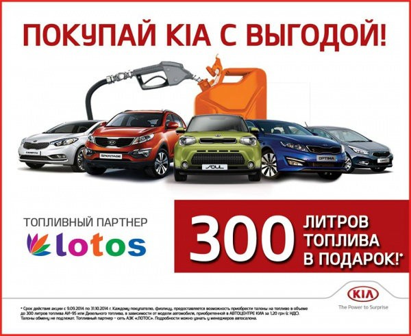 *Детали акции. Срок действия акции с 9.09.2014 по 31.10.2014 г. Каждому покупателю, физлицу, предоставляются талоны на топливо в объеме до 300 литров топлива АИ-95 или Дизельного топлива, в зависимости от модели автомобиля, приобретенной в ООО «АВТОЦЕНТР КИА» по специальной цене- 1,2грн с НДС. Талоны обмену не подлежат. Топливный партнер – сеть АЗК «ЛОТОС». Подробности можно узнать у менеджеров автосалона.