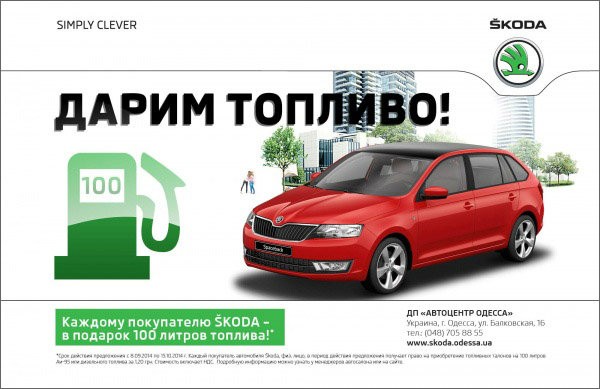 100 литров топлива в ПОДАРОК КАЖДОМУ* покупателю автомобиля SKODA!