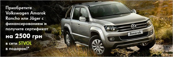 Приобретая Volkswagen Amarok комплектации Rancho или Jager в период с 01 января по 28 февраля 2014 года с финансированием от нашего партнера Финансовой Группы Порше Вы гарантированно получаете подарочный сертификат сети STVOL номиналом 2 500 грн.