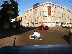 Пострадавшая упала на спину и едва не попала под колеса ВАЗа, который ехал следом. Водитель легковушки быстро затормозил и пропустил упавшую на проезжую часть женщину. Произошедшее он успел снять на авторегистратор и выложить в сеть.