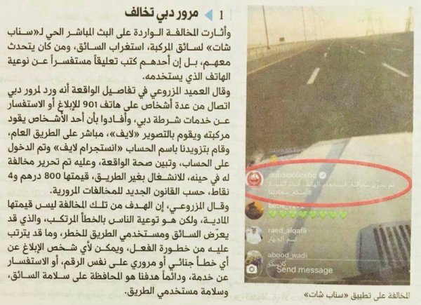 Вычислить нарушителя помогли другие участники движения, которые обратили внимание, что один из водителей постоянно отвлекается на смартфон – он вел прямую трансляцию в Instagram во время вождения. После этого полицейским не составило труда найти его и выписать штраф, сумма которого составила 800 дирхам.