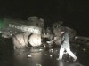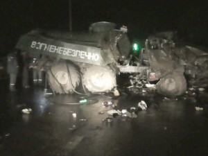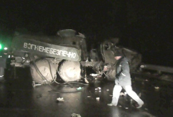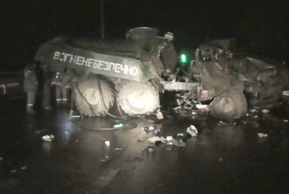 Предварительно установлено, что водитель автомобиля "Урал" с цистерной, который двигался в направлении Киева, столкнулся с тягачом "Рено Магнум" с цистерной, который стоял на обочине.