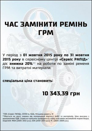 Компания «Сервис РАПИД»*, официальный дилер Acura в Украине, предлагает воспользоваться скидкой в 20%** на работы по замене ремня ГРМ и на все расходные материалы. Общая стоимость со скидкой составит 10 343,39 гривен с НДС.