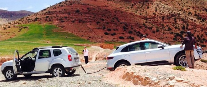 Британский журналист Гэвин Грин тестировал на днях новенький Porsche Macan на дорогах Марокко. Несмотря на то, что кроссовер предназначен скорее для езды по асфальту, мужчина решил попробовать Macan на бездорожье. В итоге пришлось идти… нет, не за трактором — за Dacia Duster, сообщает .