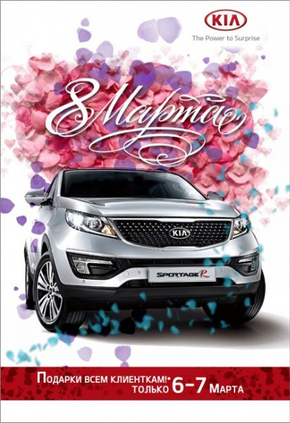 В период с 6 по 7 марта приглашаем милых дам посетить Автоцентр KIA и гарантировано получить подарок и великолепное настроение!
